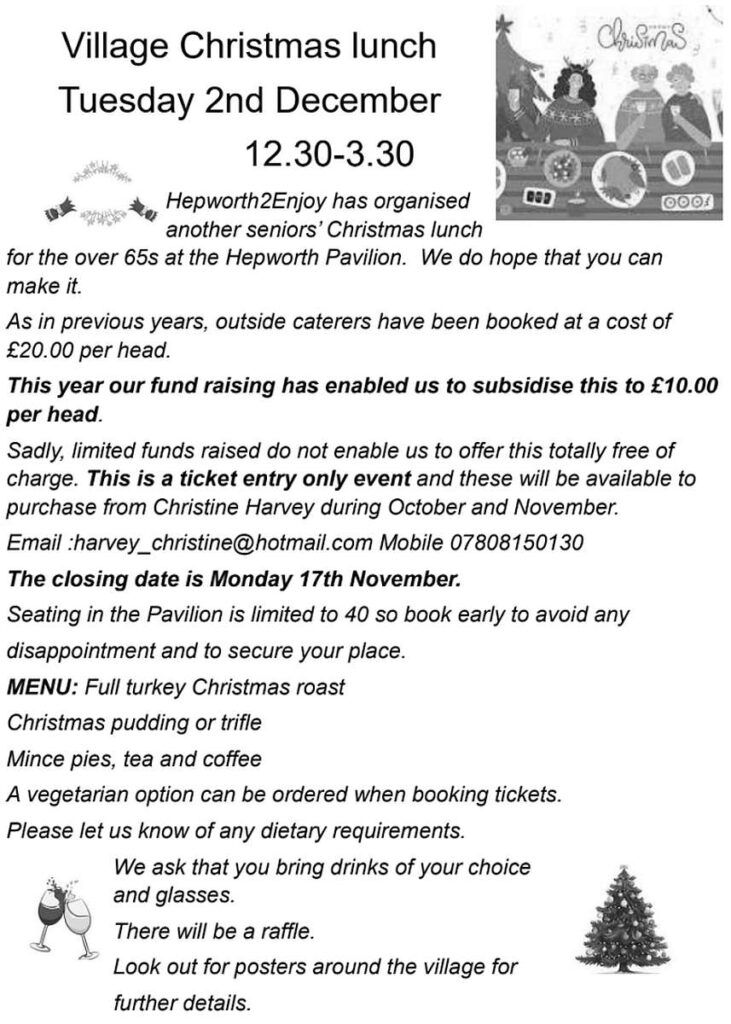 Hepworth2Enjoy has organised another seniors’ Christmas lunch for the over 65s at the Hepworth Pavilion. We do hope that you can make it. As in previous years, outside caterers have been booked at a cost of £20.00 per head. This year our fund raising has enabled us to subsidise this to £IO.OO per head Sadly, limited funds raised do not enable us to offer this totally free of charge. This is a ticket entry only event and these will be available to purchase from Christine Harvey during October and November. Email: harvey_christine@hotmail.com Mobile 07808150130 The closing date is Monday 17th November. Seating in the Pavilion is limited to 40 so book early to avoid any disappointment and to secure your place. MENU:- Full Turkey Christmas roast